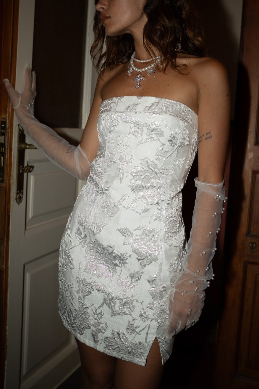 We heard you have a destination wedding coming up, welcome all your guests in style in the Bellini Silver Rhinestone Mini Dress. Short and sweet the Bellini Floral Mini Dress is our take on a little white dress adorned in silver textured florals with the perfect amount of sparkle.