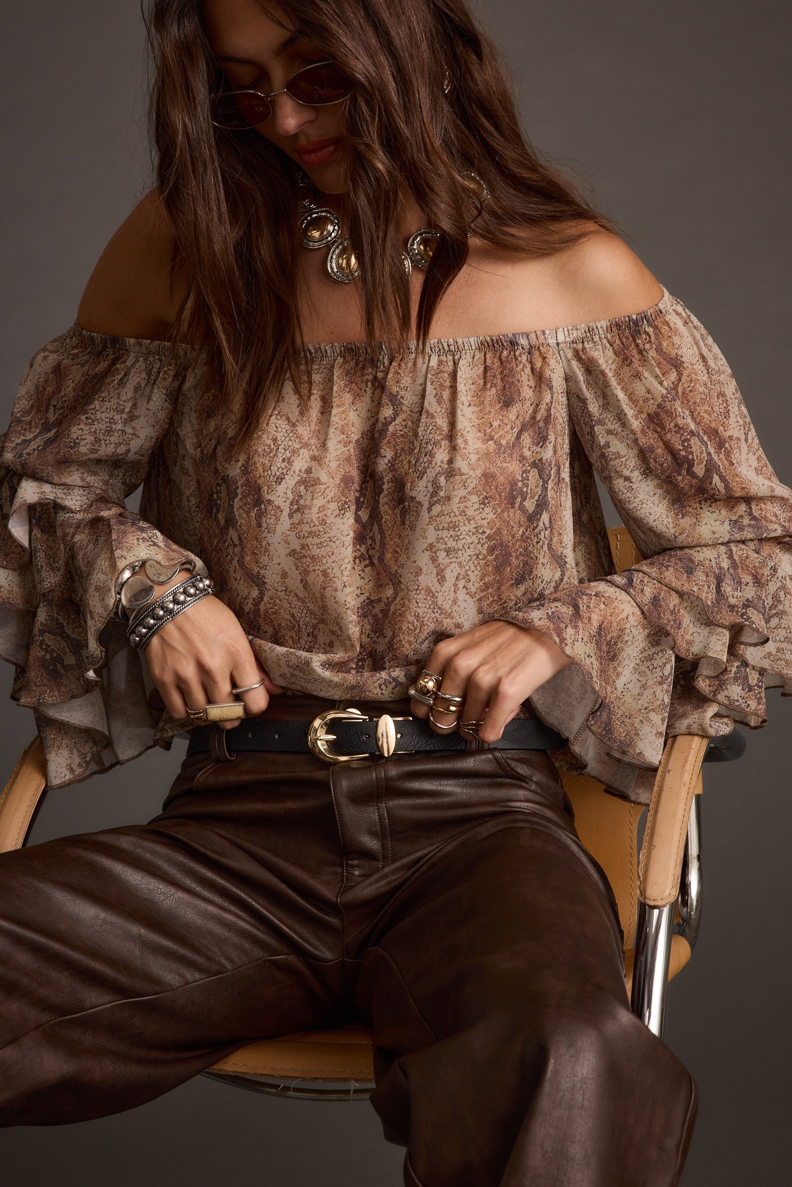 Turn everyday into a statement with the Brinley Snake Off Shoulder Blouse. Ruffled sleeves and a bold snake print bring movement and personality to every look. Elastic neckline ensures the perfect off-shoulder fit from brunch to night out.
