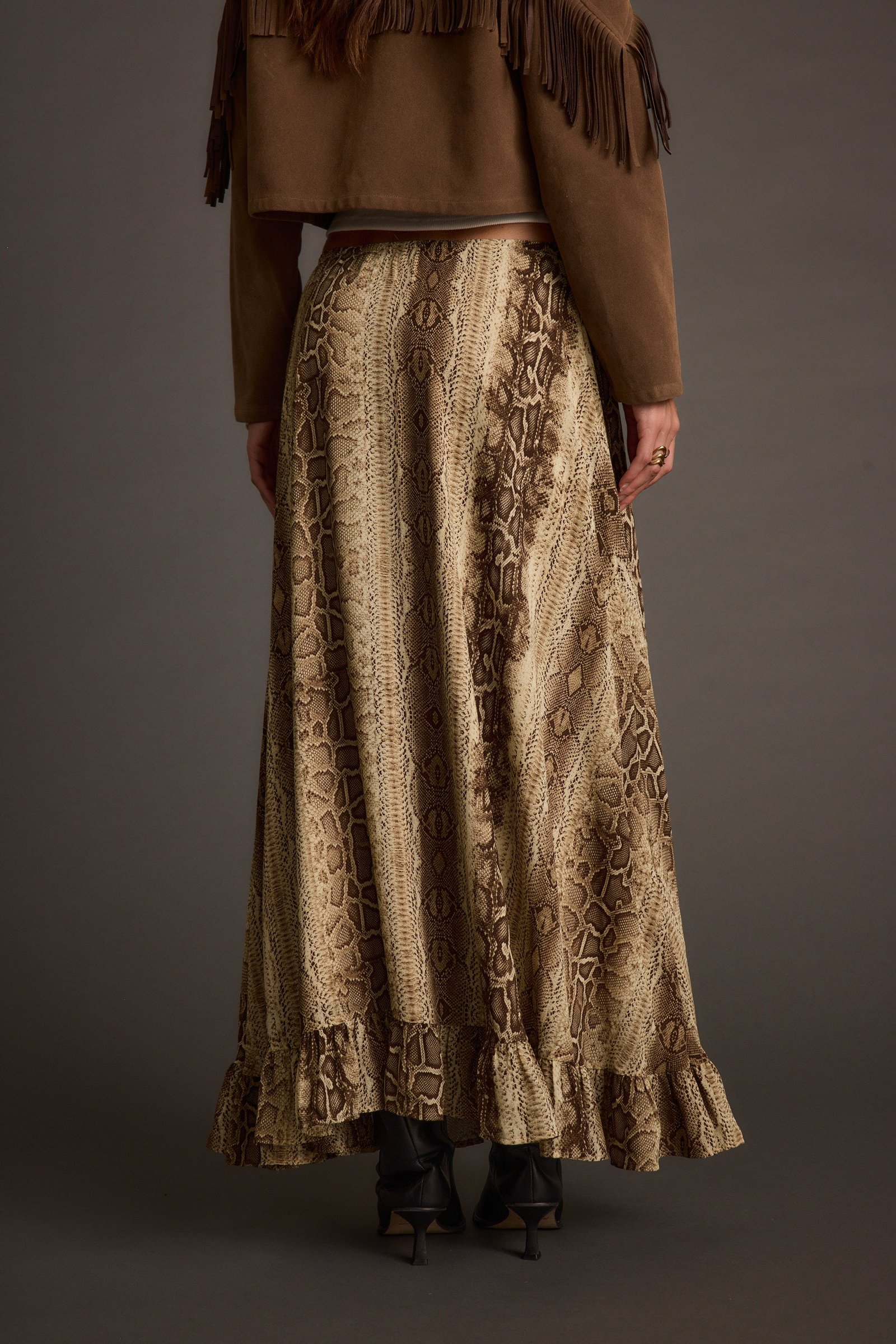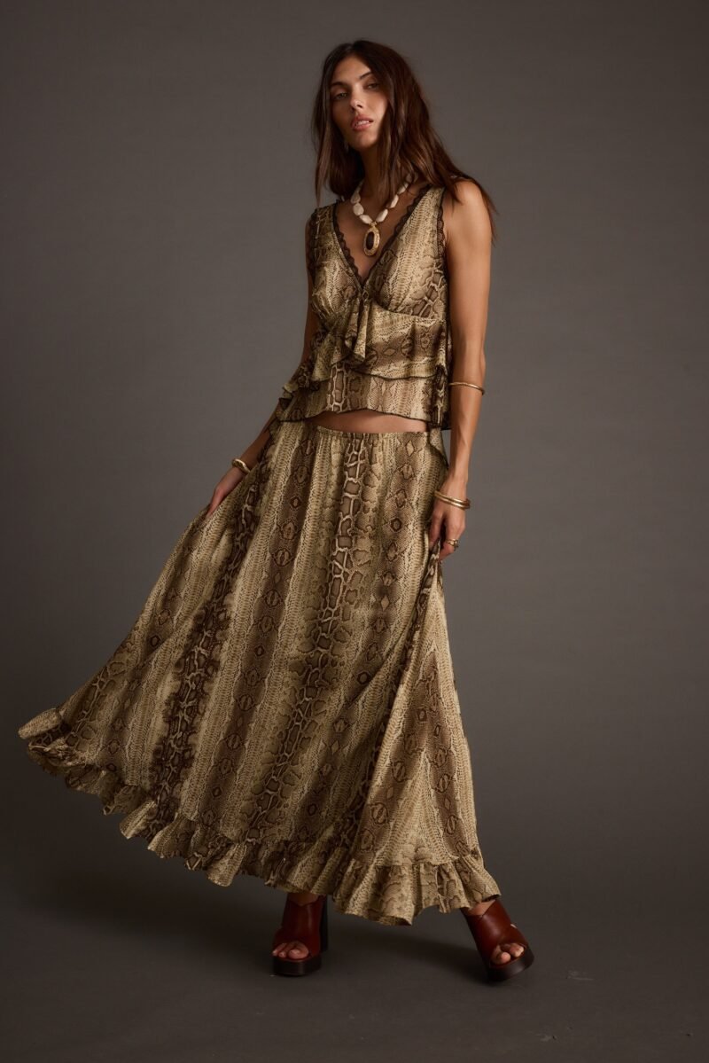 Your fall wardrobe just got a plot twist. The Calla Snake Print Maxi Skirt sways in lightweight chiffon with a ruffled hem and A-line silhouette, perfect for layering with sweaters or statement boots. Wear it mid-to-low rise, easy to wear for any occasion.