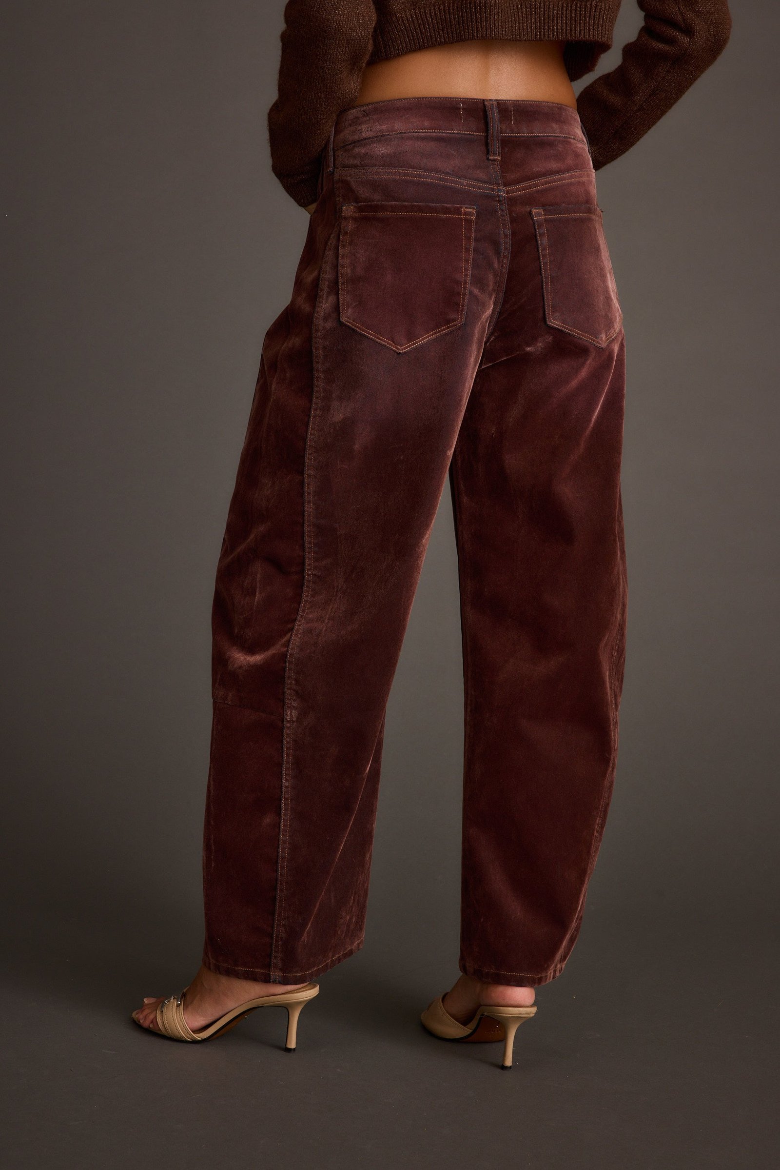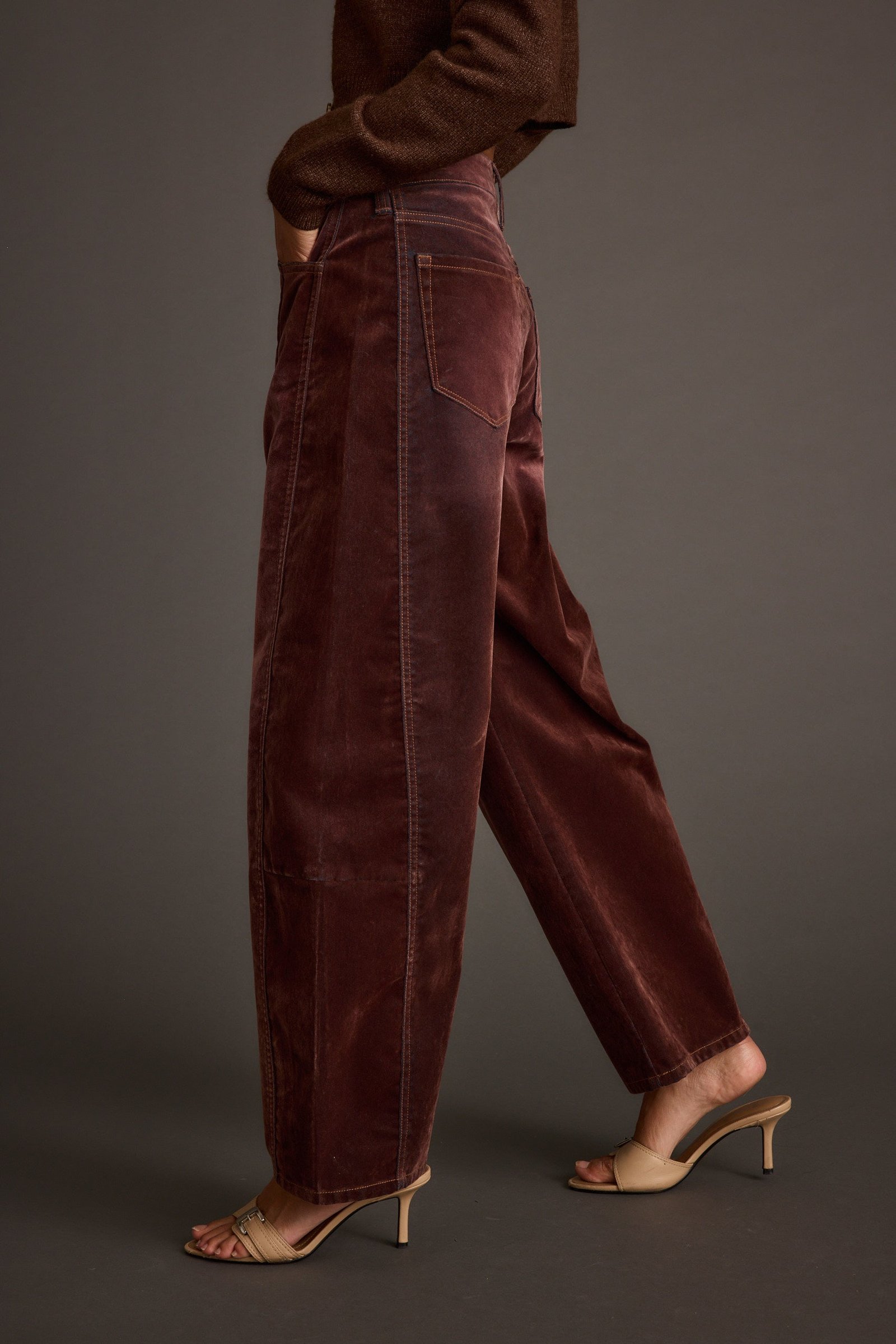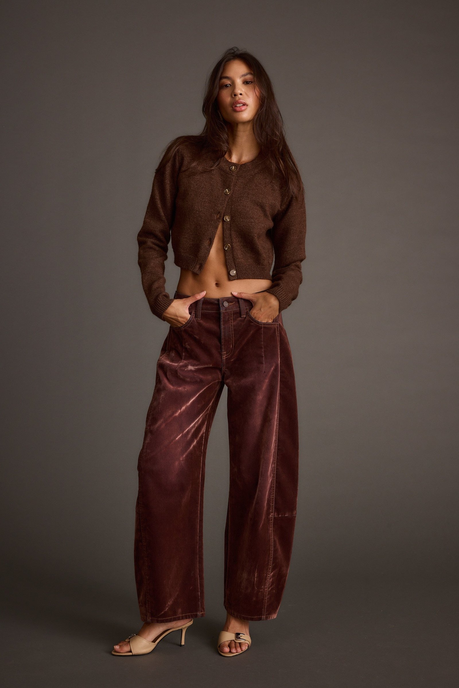 The Gracyn Mulberry Velveteen Barrel Pants feature a plush velveteen finish with a structured barrel-leg silhouette that feels both modern and elevated. Pair them with a fitted knit or the matching blazer for an instantly polished look.
