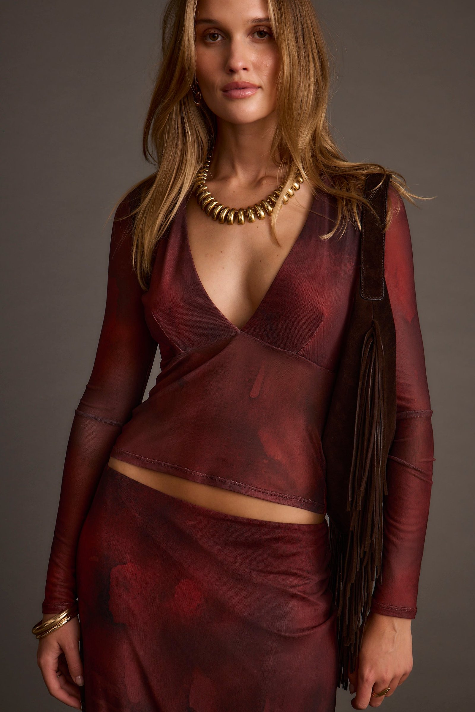 The Janie Mulberry Blur Mesh Top is a best seller for a reason. Show up in the newest mulberry blur print, with the flattering signature plunge halter neckline that looks good on anybody. Complete the look with the matching Julia Mulberry Blur Mesh Maxi Skirt.
