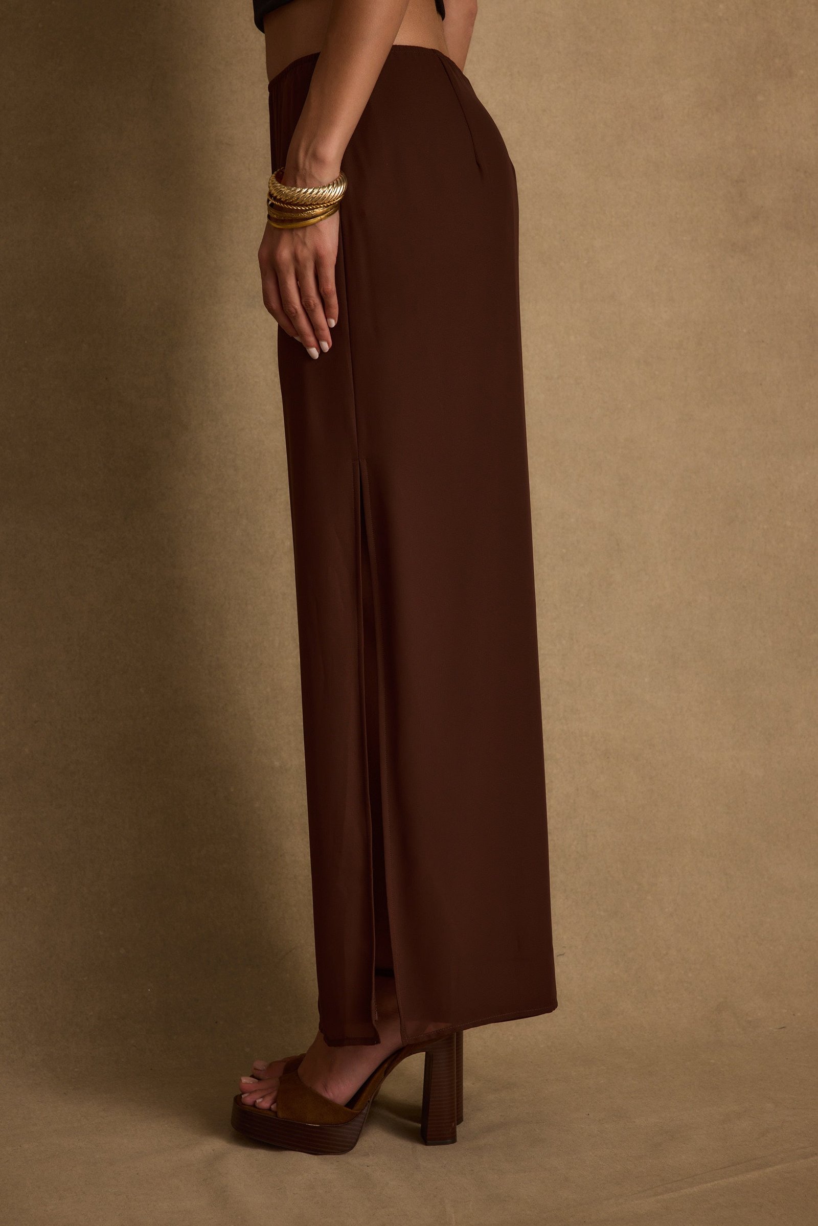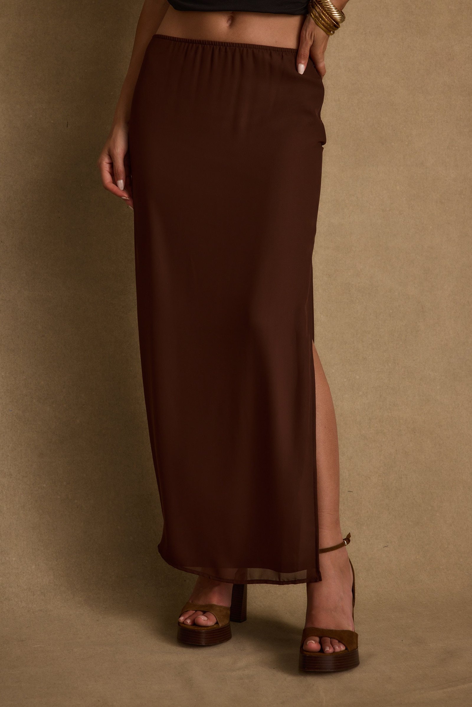 Sweet, romantic, boho – she’s Layla. Introducing the effortlessly chic Layla Mocha Set. From a luxe chiffon material, the Layla Maxi Skirt with a slit to the side is so dreamy on it’s own with a leather jacket and even better with the matching Layla Mocha Long Sleeve Top.