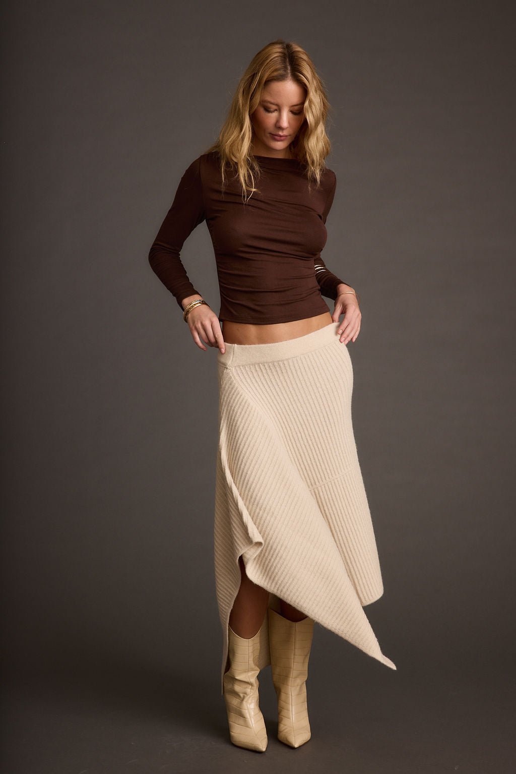 Meet your new neutral staple: the Mod Cream Asymmetrical Skirt. It features a soft ribbed knit material, flattering midi length, and asymmetrical hem. Pair it with the Mod Cream Asymmetrical Blanc Cream Off the Shoulder Sweater for the full modern look.