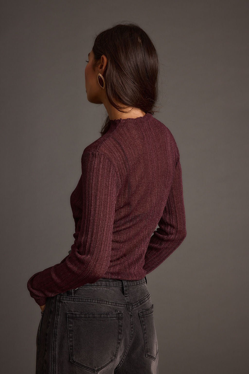 A little shimmer goes a long way. The Rania Mulberry Mock Neck Top is crafted from a semi-sheer metallic knit that catches light in all the right places. Tuck it into leather pants or layer under a blazer for instant night-out energy.